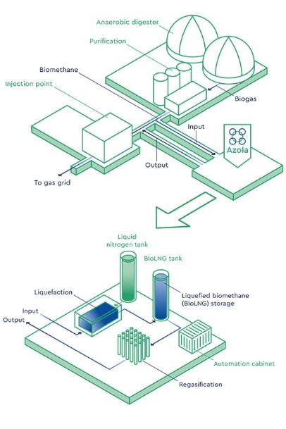 Azola solutions were developed to provide increased flexibility to biomethane producers (Azola BIO) as well as to grid infrastructures (Azola GRID)by temporarily storing biomethane under liquid form. They were also developed to shift the timing of injections to periods when grid consumption outweighs instantaneous biomethane production. The technology behind the Azola process (under research since 2014) is based on a liquid nitrogen open cycle and where nitrogen is further valorized to regenerate the polishing unit's adsorption columns. This is combined with a proprietary CO2 purification process. Azola developed a modular, no rotary machinery and low capital expenditure (CAPEX) solution for biomethane producers that comes with an integrated polishing, liquefaction-cryogenic storage, vaporization-reinjection, and plant control solution. The reinjection module uses a pressure build up (PBU) system to vaporize and reinject the stored liquid biomethane into the grid. The entire process is automated for start-up and shutdown and could be remotely controlled and operated.